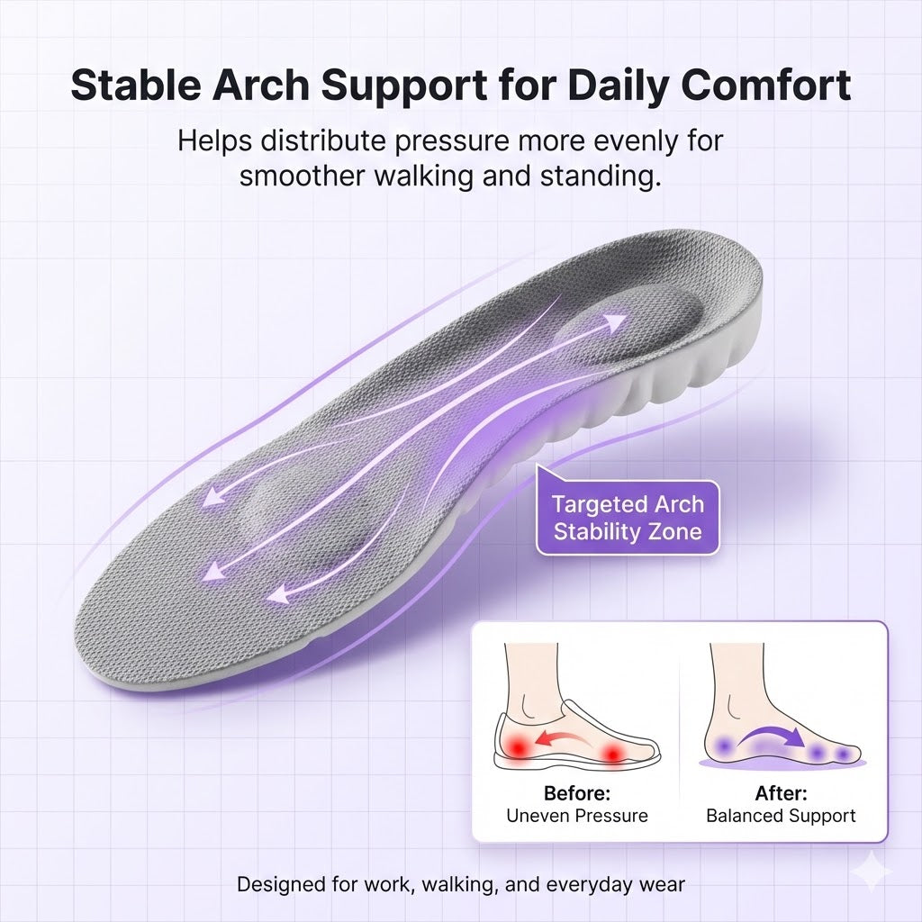 Contoured arch support helps improve daily stability, while the cut-to-fit design makes sizing simple for different shoes.